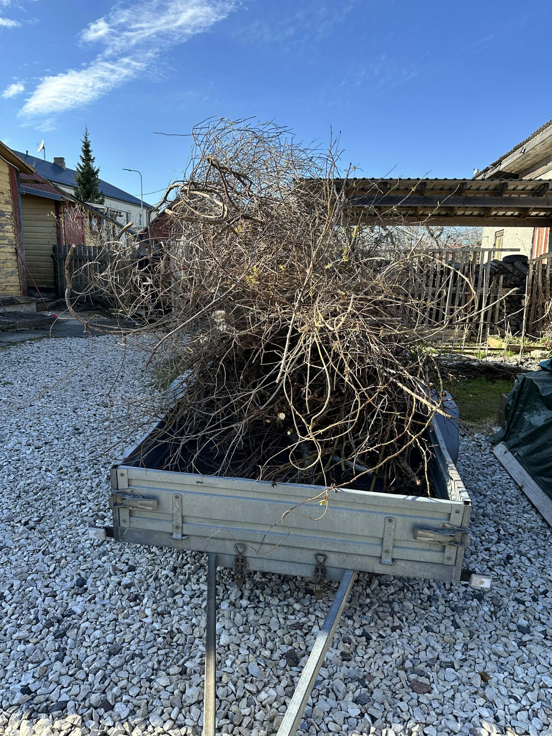 Oleme jupi kaupa aias oksi lõiganud, roose rappinud ja ükspäev võtsin täiesti maha isegi välisukse taga laiutanud kuslapuu. See kuslapuu nühkis mööda naabri seina ja ajas ennast igale poole vahele, ei tahtnud, et ta maja kahjustab. Juure jätsin alles, ehk sealt mingid noored võsud tulevad, aga kui ka ei tule, siis pole sellest miskit, sest nagunii ta jääks siin majanurgas ehitamisele ka ette. Mrt viis nädala sees oksakoorma jäätmejaama.