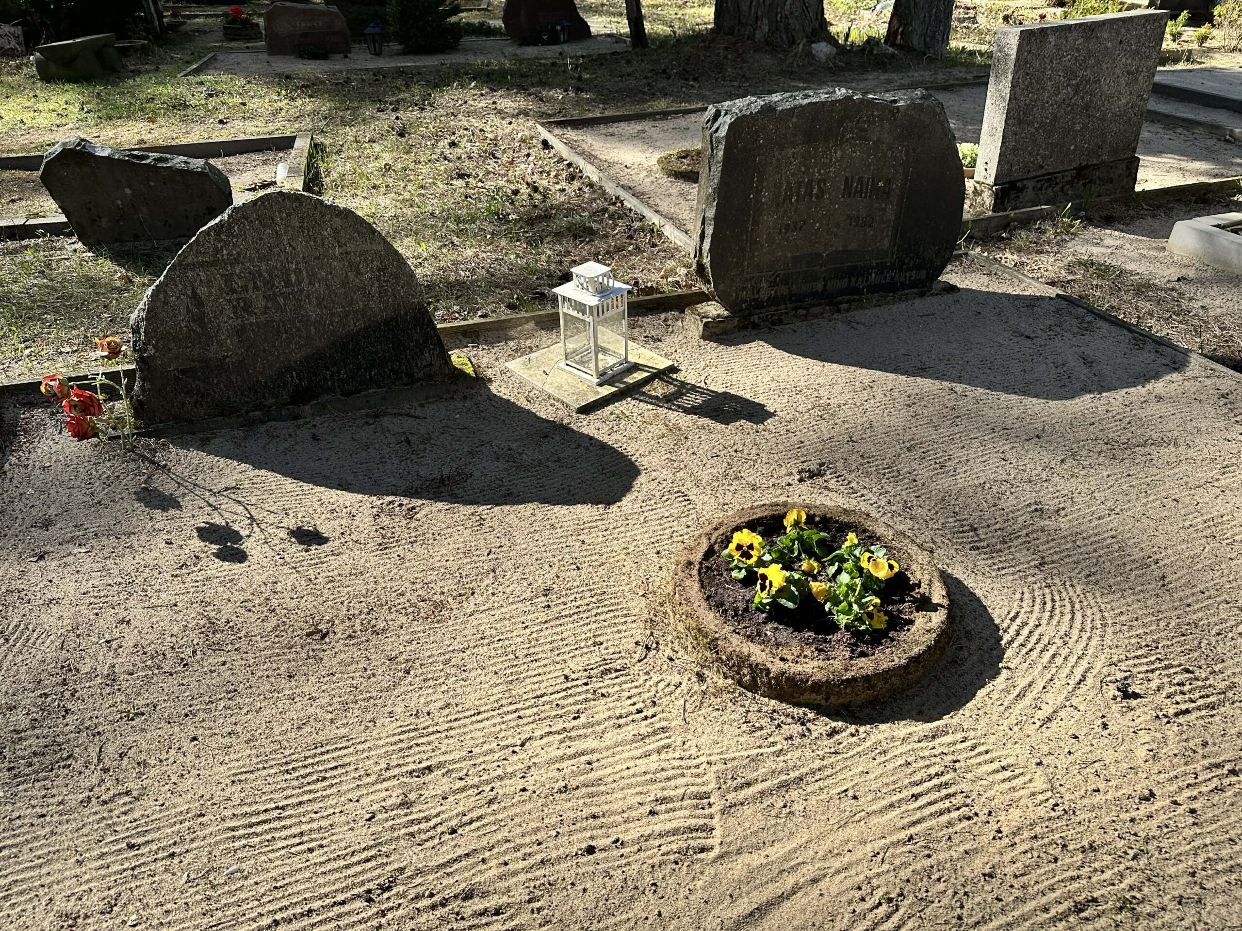 Õhtupoole väntasin rattaga kalmistule ja tegin platsid korda. Võtsin üles kanarbiku, mis oli juba kaks aastat seal kasvanud, ja istutasin asemele kollased võõrasemad.