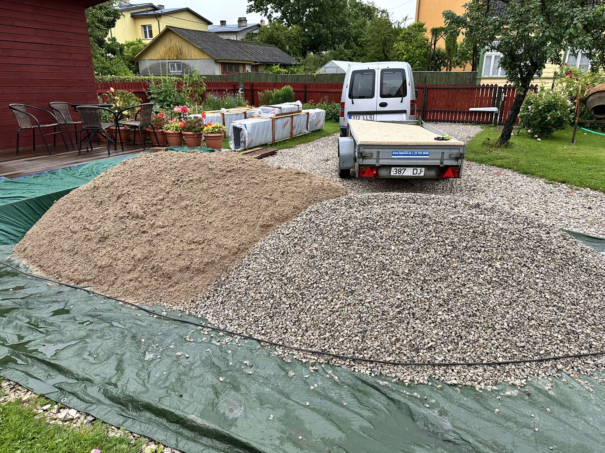 Eile kärutas mees veranda põrandasse seitse haagisetäit liiva juurde, kokku 3,5 tonni. Sellele kulus peaaegu terve päev. Pärast veel silus ja tegi ettevalmistusi betooni valamiseks. Vahepeal oli mega padukas ja äike, õhtul tuli veel selline vihm, et tänav muutus jõeks ja vesi hakkas ühest kohast vundamendi alt majja pressima. Verandaalune on olnud kogu aeg märg just seetõttu, et tänav on ehitatud kõrgeks ja sealt kõik vihm majadele voolab. Saab siis nalja näha, kas peale teeremonti see jama ükskord kaob.
