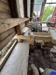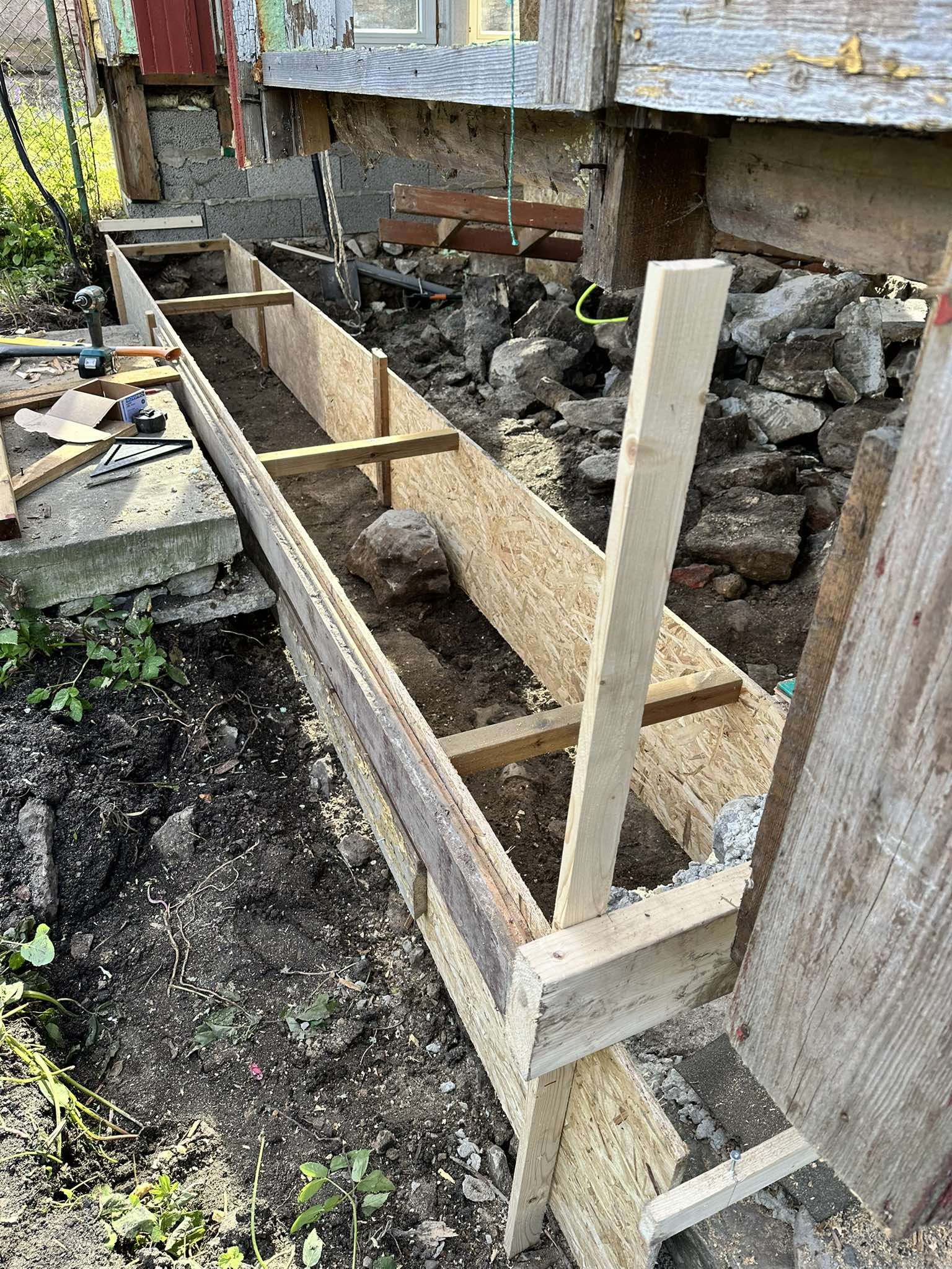 Ma ei tea, mis ime seda verandat küll püsti on hoidnud, kui polnud vundamenti ja tugipostid olid kõik allosast mädad. Võibolla see on ta päästnud kaela kukkumast, et ülemised palgid on kõvasti maja küljes kinni. Vanast verandast ei jäägi ilmselt muud alles, kui ainult ülemine palgijooks, kõik muu tuleb välja vahetada. Lihtsam oleks olnud kõik minema tassida ja puhtale platsile uus veranda ehitada, aga samas – kui seinad jupi kaupa välja vahetada ja ühe poole kaupa teha ka vundamenti, saab ikkagi katuse all toimetada ja pole vaja leiutada, kus hoiustada aknaid ega pea muretsema, et tänavale avatud õuest tööriistad minema jalutavad. Ehk et see asi siin näeb ikkagi välja nagu renoveerimine, mitte uue ehitamine, väljastpoolt.