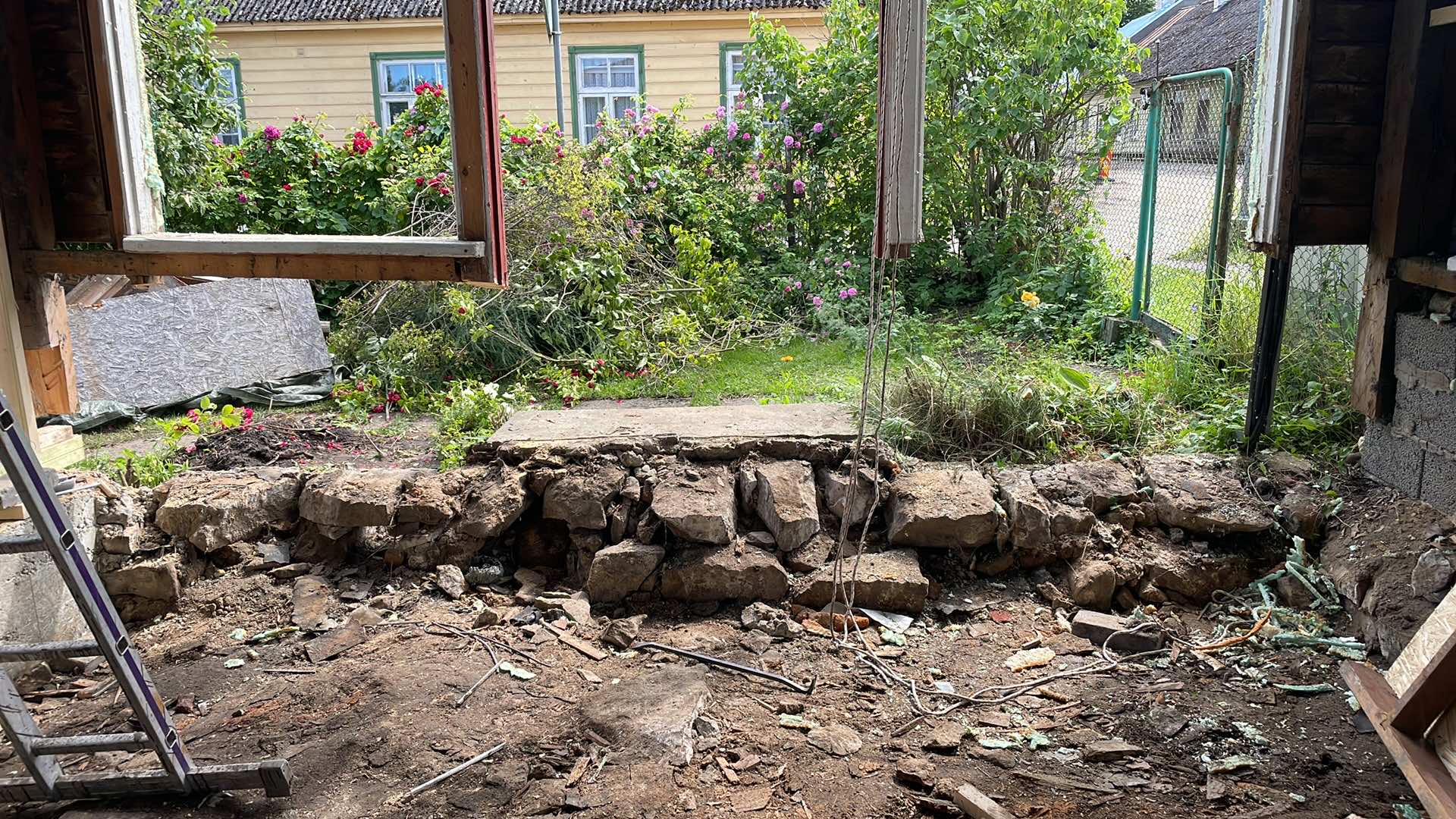 Veranda eesmises nurgas valas Mrt vundamendi kaheksa sentimeetrit kõrgemaks ja siis hiljem kergitas veel maja lisaks neli sentimeetrit. Hoone tõstmiseks on tal üks hea tungraud, mille suvilast ära tõin. Kuna siin hoovipoolses nurgas enam ammu vundamenti nagu polnudki, suured kivid olid lahti ja osalt välja kukkunud, siis polnud miskit, mis verandat paigal hoiaks ja nii see osa allapoole tuli.
