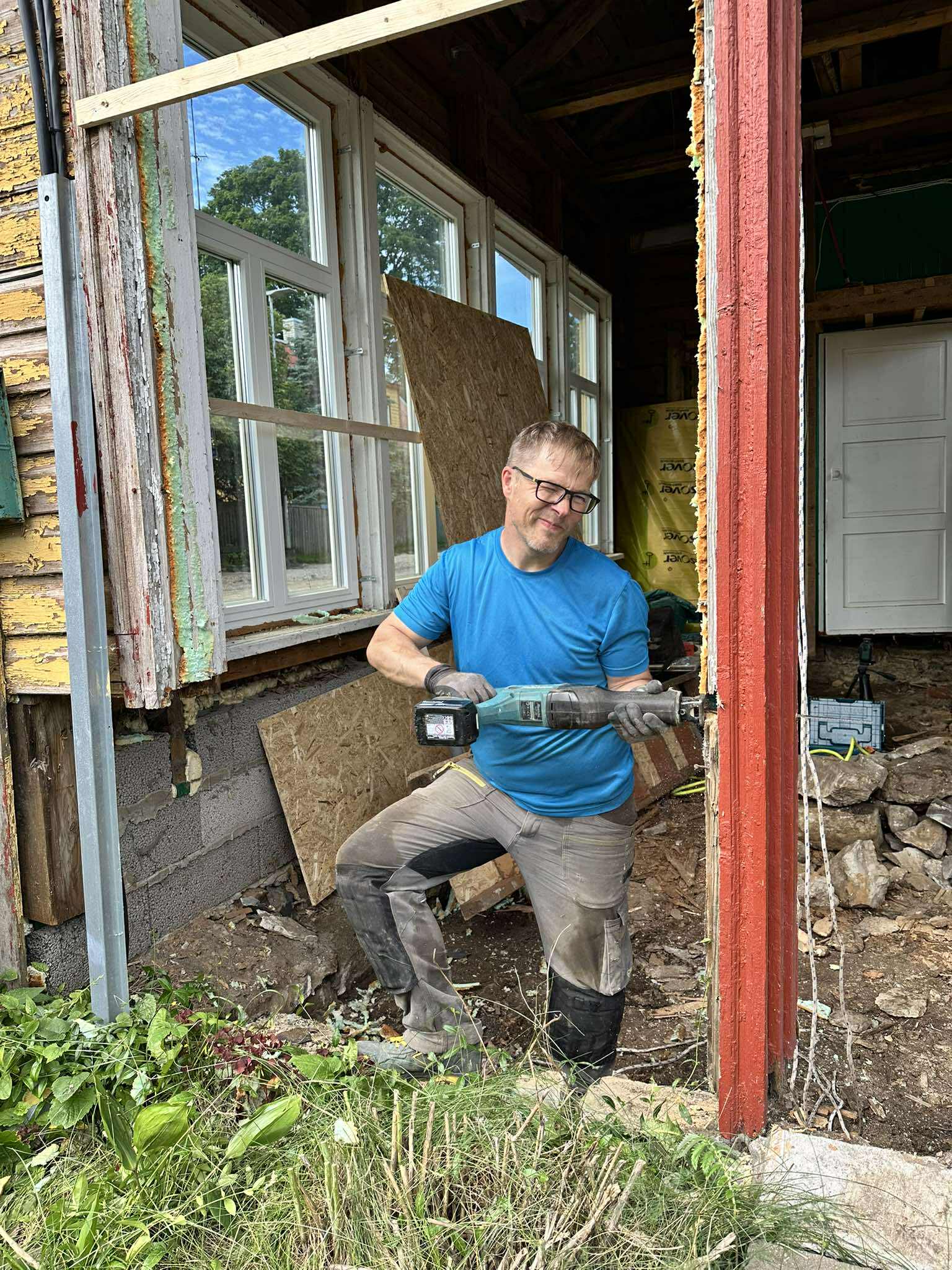 Verandal võtsime eile eest ka kõik teepoolsed aknad. Jõudsin kõigil akendel vana vahu maha kraapida, sellest on mu uutel töökinnastel nüüd sõrmeotstes augud. Õhtupoole ma muud ei teinudki, ainult koristasin ehitusplatsi, sest Mrt muudkui lammutas ja vanu lauatükke lendas. Päeva lõpuks oli tööjärg sealmaal, et veranda eesosale olid uued toed pandud, üks neist küll ajutine (on praegu ühe akna kohal). Kõige raskem on mehel olnud ilmselt maja kergitamine, eile ta pidi tõstma tänavapoolset nurka lausa 12 sentimeetrit. Aga nüüd peaks veranda igatahes olema sirge igatepidi.