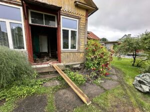 Veranda putitamine on jõudnud sinnamaani, et üks sein on toestatud, vanad palgid ja prussid on uute prusside vastu vahetatud. Vahepeal elasime üsna ilma seinata, ainult napikas koormakate hoidis tormi eemal.