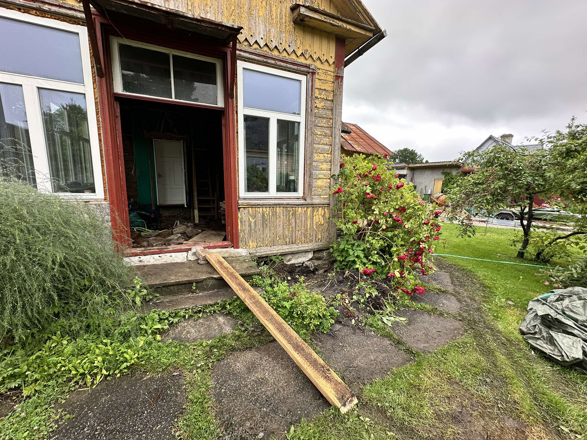 Vana uks ripub pmst õhus ja akende vahelt vilistab tuul läbi, sest veranda tõstmiseks lõikas mees nende vahelt vahu ära. Väljastpoolt vaadates on see nurk, kus roos oli, täiesti ripakil. Ja õue peal on vaenekesed roosihunnikud.