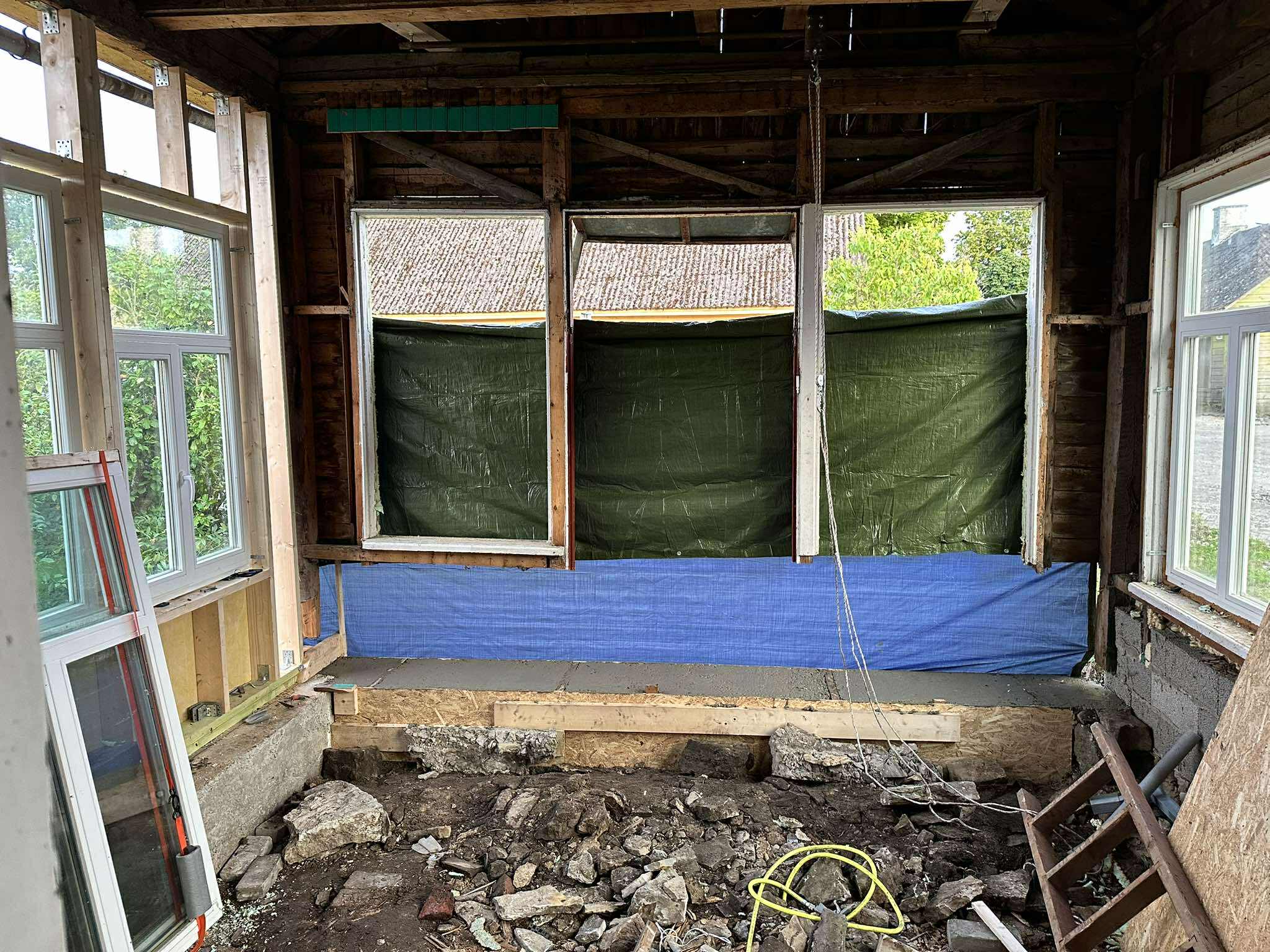 Kaks akent on seal, kus olema peavad ja neid peab liigutama ainult korra veel, kui fassaadilaud ka paigas, et väljast ei jääks nö auku. Kuus akent veel vaja eest võtta ja tagasi panna ja see on kahekesi sebides isegi tali abiga raske. Uskumatu, et siis, kui uued aknad esimest korda ette panime, meil polnud mingit trossi lakke kinnitatud ja ometigi saime nõksu kaupa aknaid ülespoole upitades need ka tookord kahekesi paika. Aknad on vastikult rasked ja nende liigutamise teeb keeruliseks, et verandal on põranda asemel sügav auk.